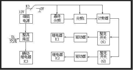 继电器有晶体振荡器、分频器、整定开关、驱动电路和电源回路等组成。当继电器施加额定电压时,继电器内部瞬动继电器和两个延时继电器瞬时动作,触点切换,并使电源回路与计时回路处于失电状态,以提高继电器抗干扰性能。当输入电压大大降低或完全消失时,瞬动继电器瞬时返回(两个延时执行继电器仍处于动作状态),触点也瞬时返回,使储能电源接通计时回路,晶体振荡产生时钟脉冲,经分频后得到10ms计时脉冲,计数器对计时脉冲计数,当所计脉冲数与整定开关值符合时,驱动执行继电器返回,完成断电后延时返回的功能。原理图如下图所示